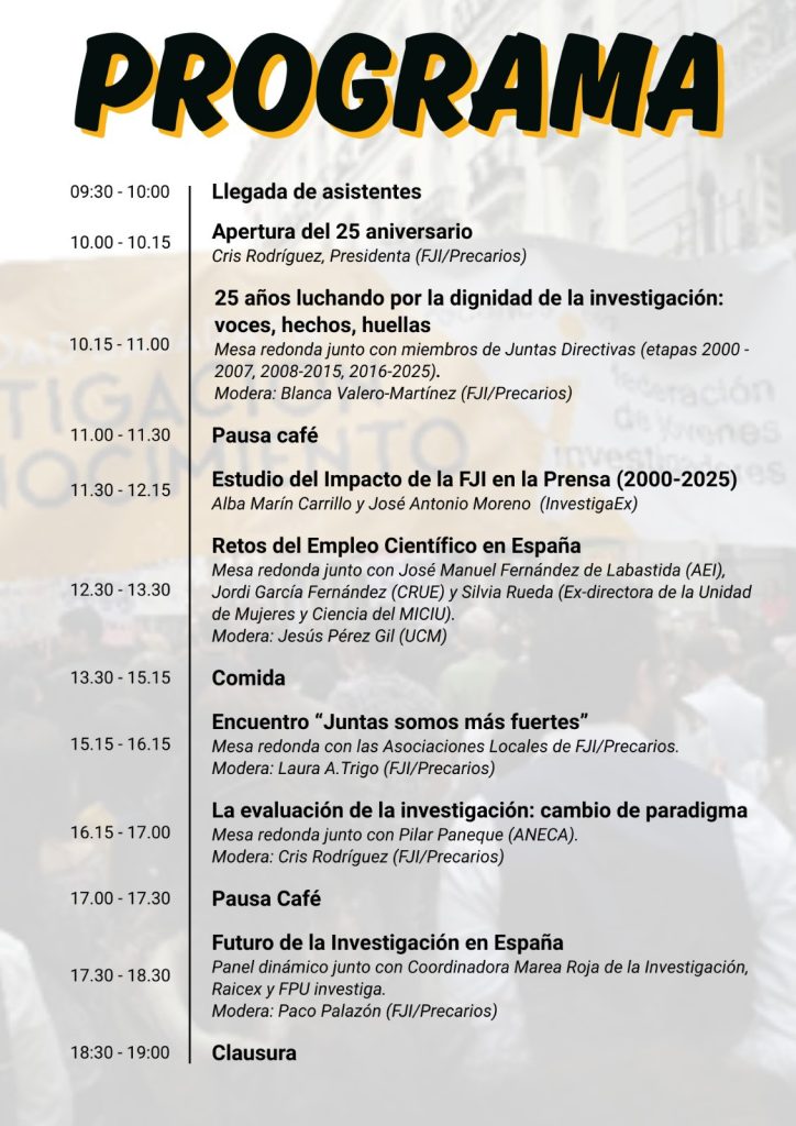 - 10.15- 11.00. 25 años luchando por la dignidad de la investigación: voces, hechos, huellas. Mesa redonda junto con miembros de Juntas Directivas (etapas 2000-2007, 2008-2015, 2016-2025). Modera: Blanca Valero-Martinez (FJl/Precarios)